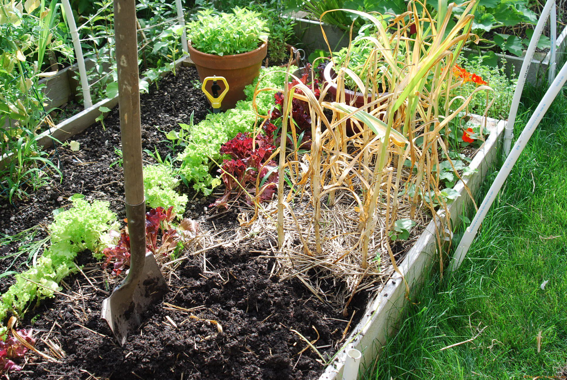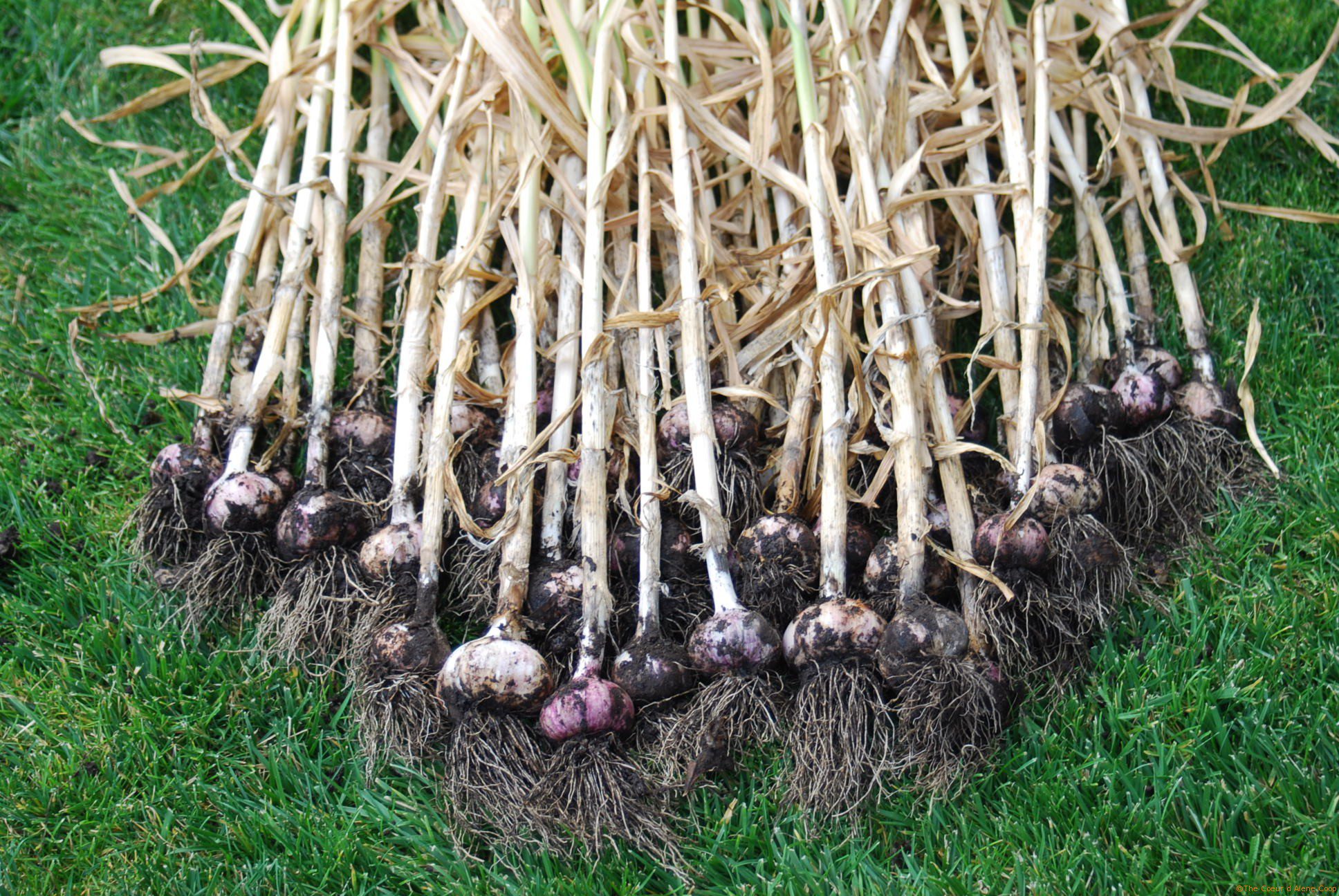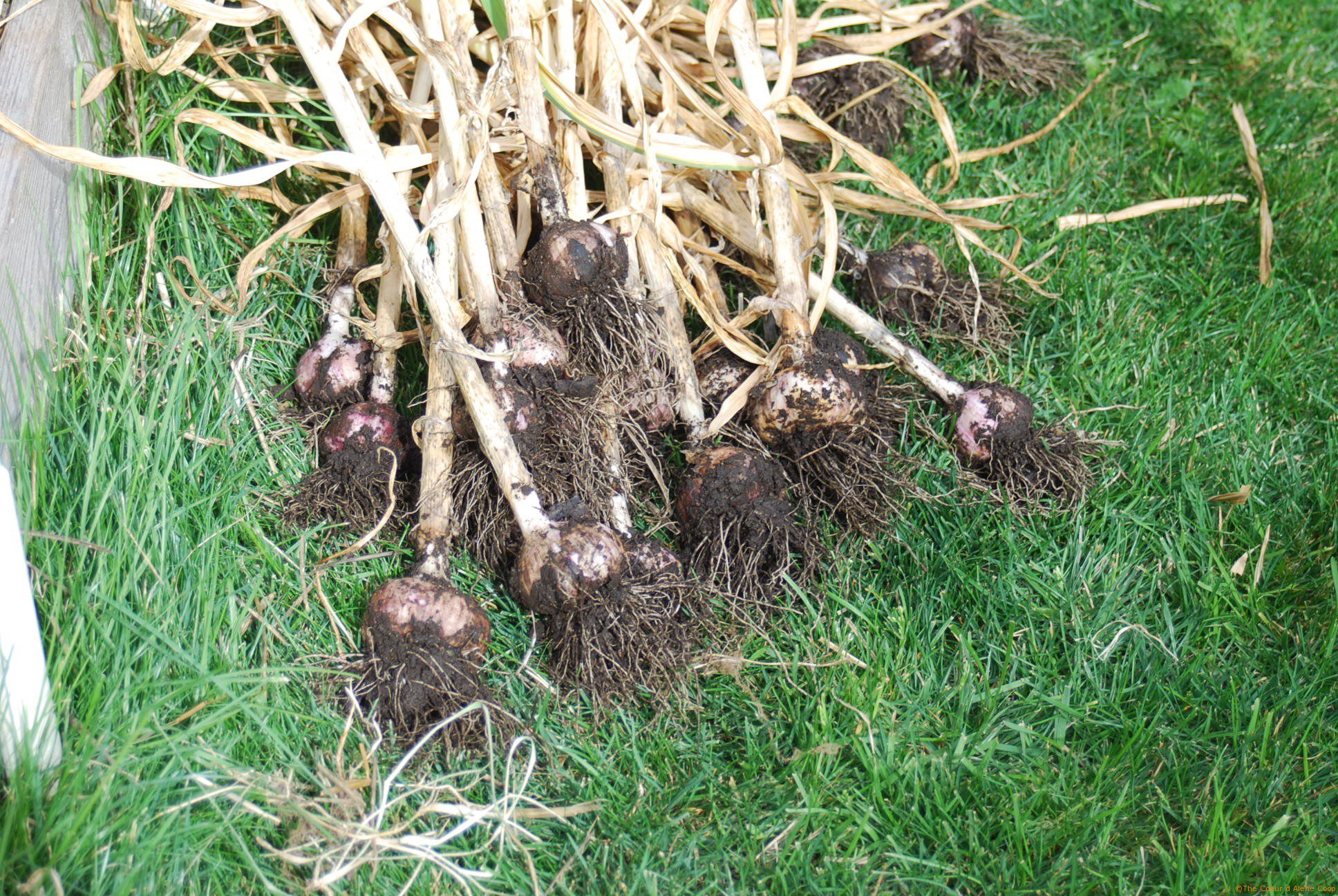 Garlic is a bit different. You’re getting close to harvest time when the leaves start to brown, but there are still a few green leaves present. That’s the time to stop watering. Well, if you can. Our garlic was planted in a bed next to the sprinkler that waters half the garden. This didn’t appear to cause any problems to the bulbs, but I can see how less water would help in the curing; and let’s face it, dry dirt cleans off better than a muddy clump!