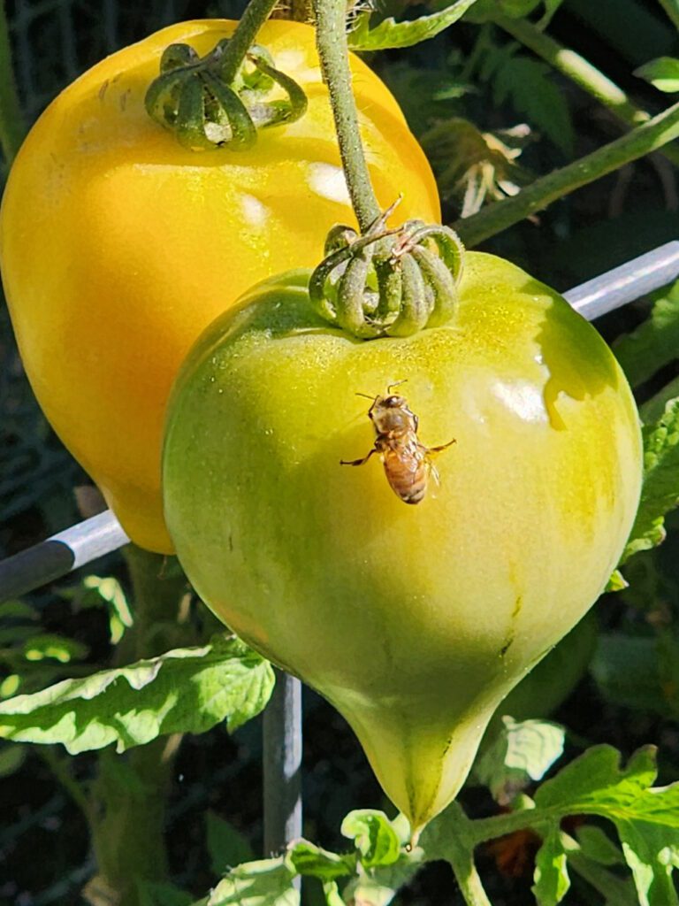 For example, two types of tomatoes grow side by side: a large, red beefsteak and a small, yellow cherry. Although both are self-pollinating, cross-pollination could still occur (busy bees!).